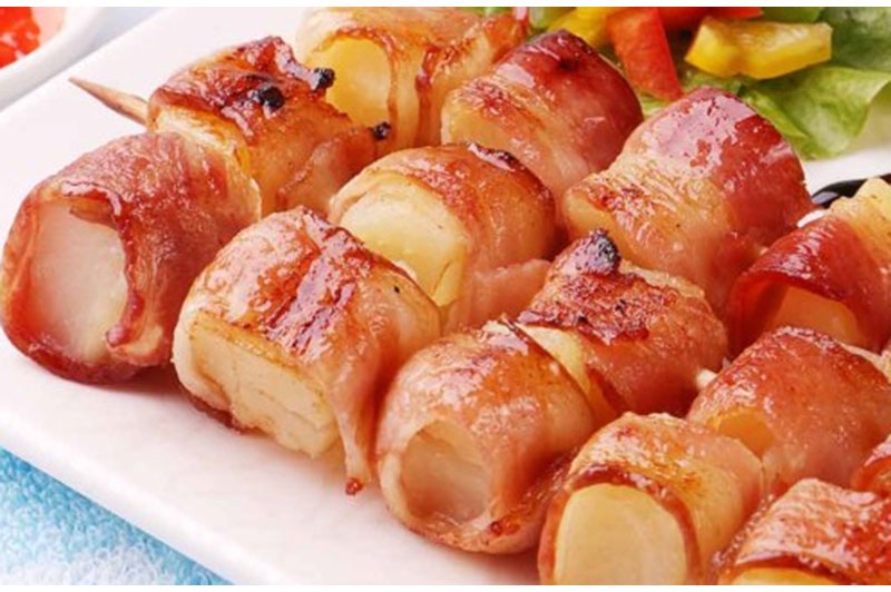 2.把芝士和土豆泥鋪在培根上卷起,并用牙簽固定;